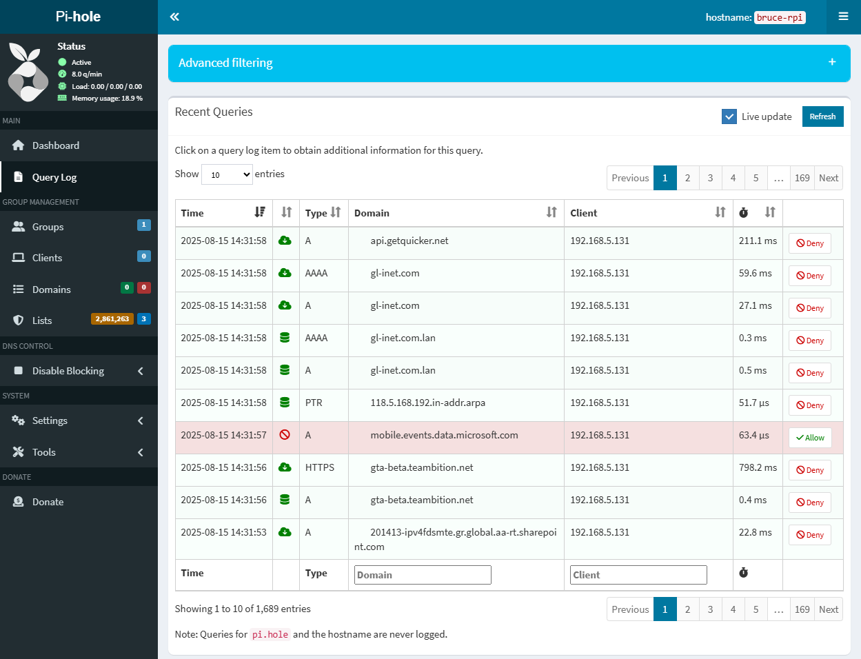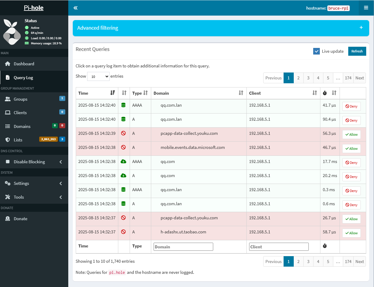 Regardless of any of the above methods, when router VPN client is enabled, through the Pi-hole log, all LAN clients can resolve normally through Pi-hole DNS server: