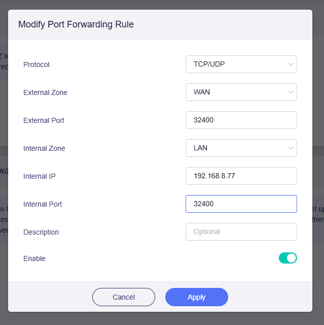 After that, it should work as expected. You can test access using a mobile device on cellular data by connecting to your public IP and external port.