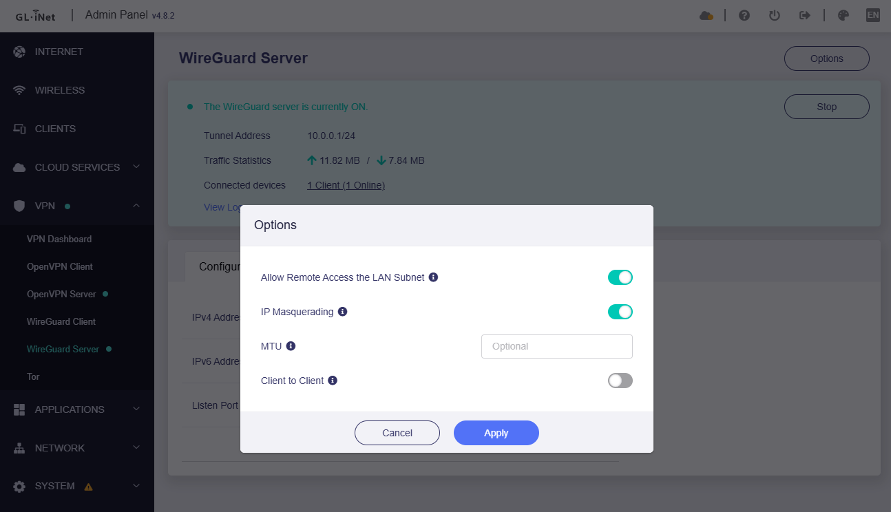 I have access to the LAN because i can connect to my server (192.168.8.20) via ssh (port 22) using the same phone and conected to the Flint wireward VPN in the same way.