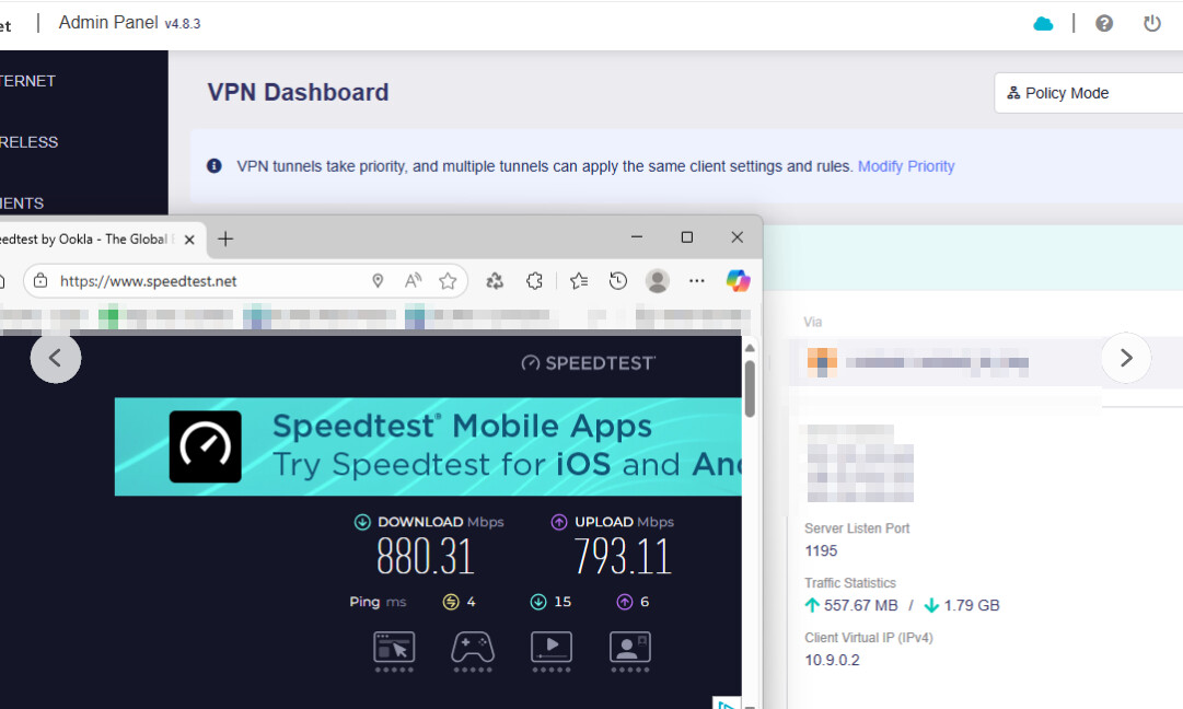 VPN throughput (LAN‑to‑Internet via WireGuard or OpenVPN) ~600 Mbps on a 1‑Gbps link ≈10 Mbps – essentially unusable