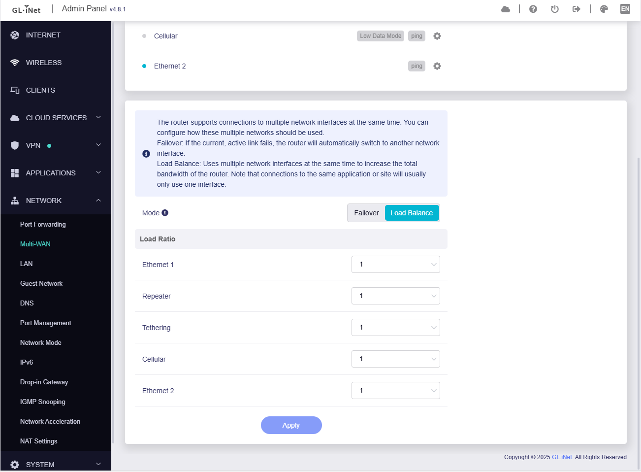 Connects to 2 WANs and Multi-WAN mode is Load Balance.