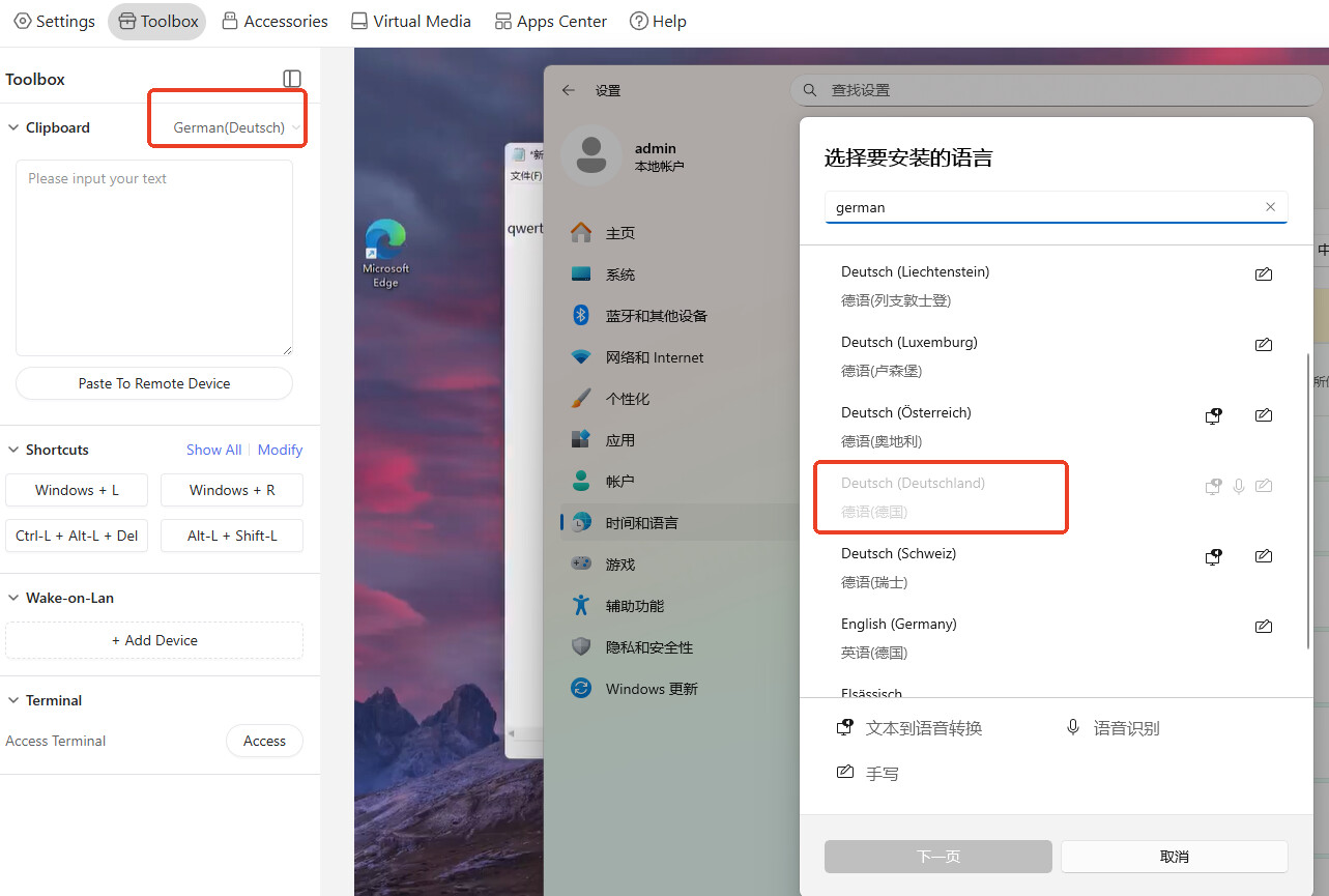 My setting is as follow. ALL are set to Deutsch (Deutschland). The controlling, controlled device and clipboard language.