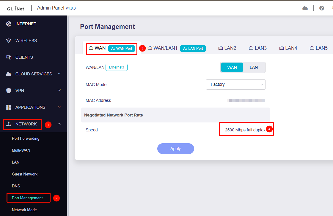- Access the Flint 3 Admin Panel and configure the WAN connection type as needed (PPPoE or DHCP). You can refer to: