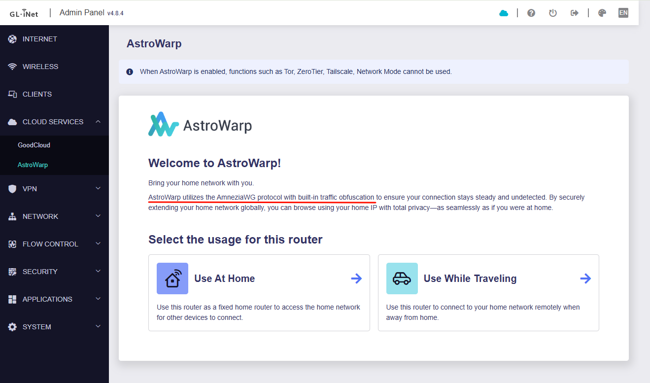 Below is a pasted copied of an email I received from Bernard Lo of GL-inet tech support saying that Astrowarp Plus “is using an obfuscation VPN”.