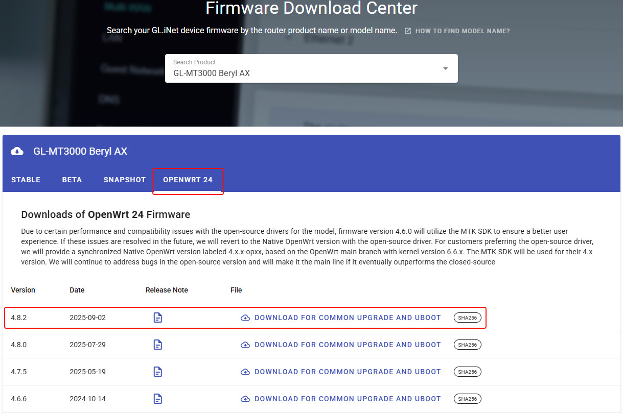 The tab "stable/beta/snapshot" are all closed-source firmware, and only "openwrt24" is an open-source SDK.