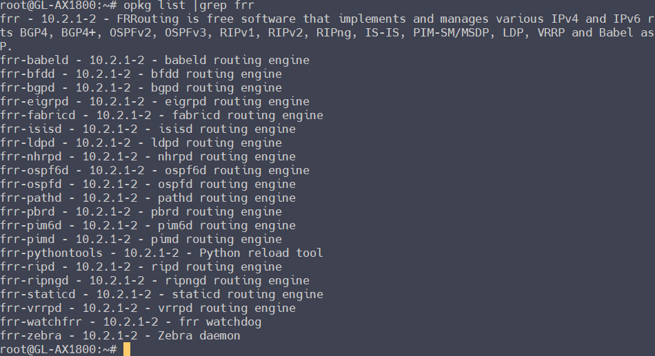 frr - 10.2.1-r2 - FRRouting is free software that implements and manages various IPv4 and IPv6 routing protocols. Currently FRRouting supports BGP4, BGP4+, OSPFv2, OSPFv3, RIPv1, RIPv2, RIPng, IS-IS, PIM-SM/MSDP, LDP, VRRP and Babel as well as very early support for EIGRP and NHRP.