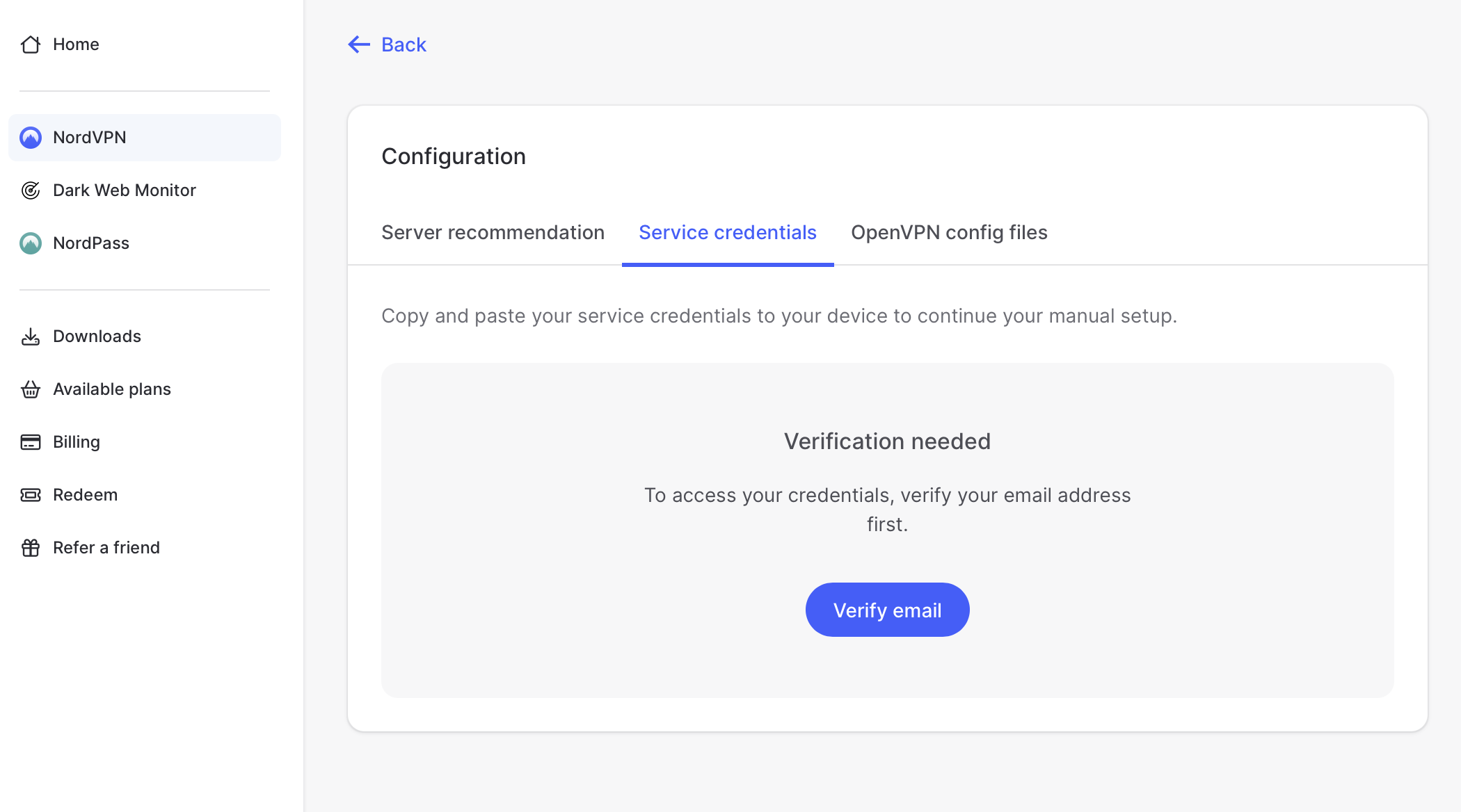 - Click on the 'Service credentials' tab and then on 'Verify email'