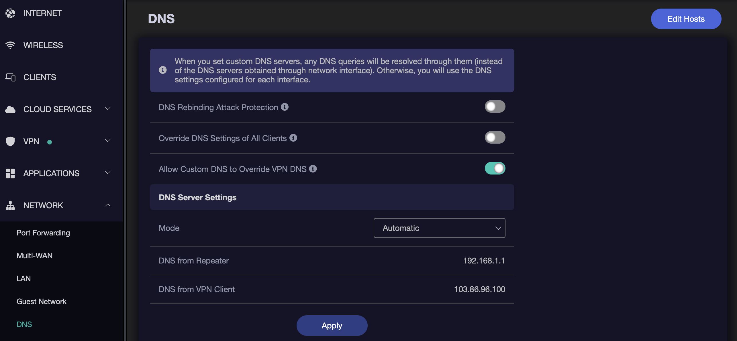 - Make sure that the 'DNS Server Settings Mode' is set to 'Automatic' and that you can see 'DNS from Repeater' and 'DNS from VPN Client'