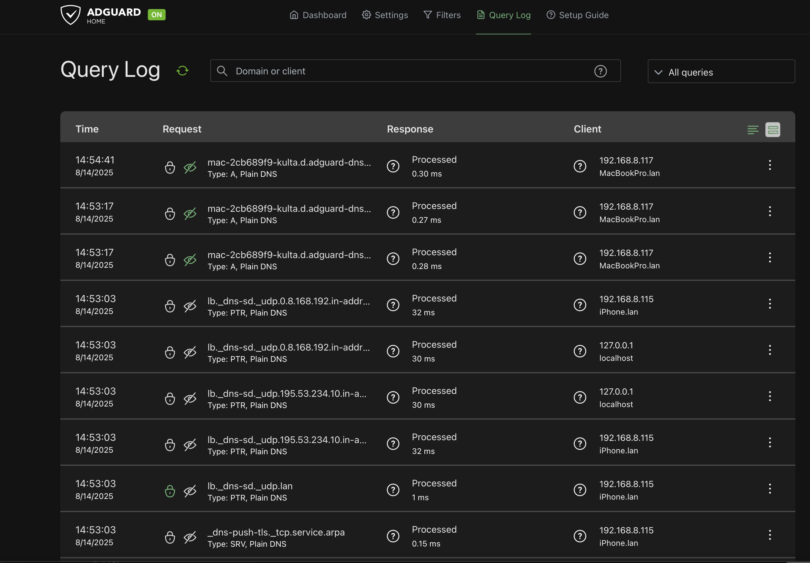 Finally, you will be able to see all the queries in the 'Query Log' in the AdGuard Home Settings Page (where we configured the DNS and filters etc. - it is the last tab).
