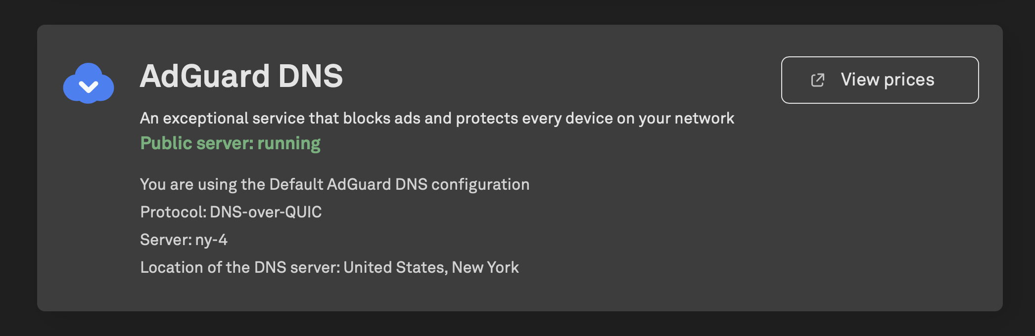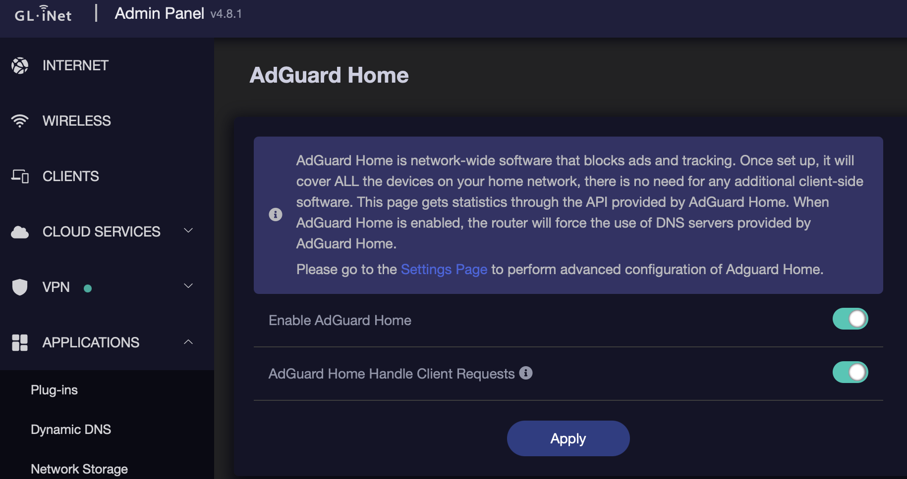 - Toggle on 'Enable AdGuard Home' and hit 'Apply'
