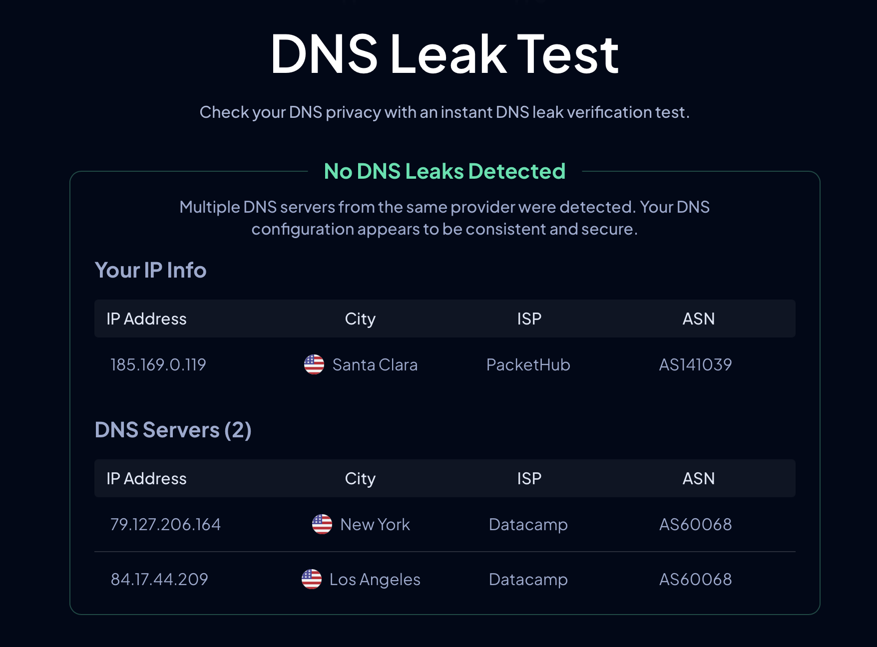 - Check for DNS Leaks. Google 'DNS Leak Test' for links. I like to use the one by ControlD