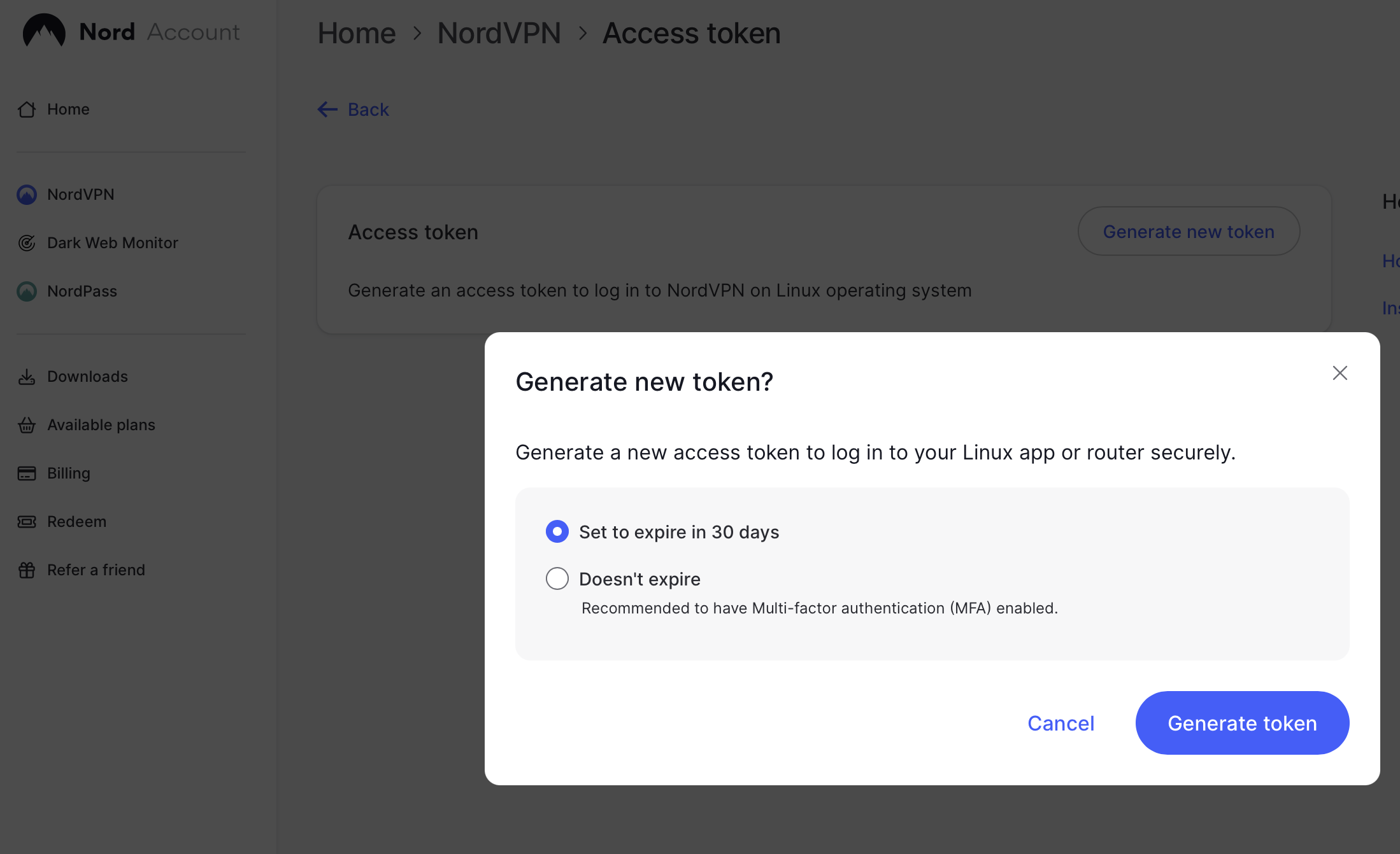- Once you have logged into your NordVPN account, then click on the 'NordVPN' link on the left sidebar and then on the page that loads, scroll all the way down, to 'Get Access Token'. You might need to verify your email again. Once the page loads, click on 'Generate new token' and choose the length of token validity. If you choose 'Doesn't expire' make sure you have MFA enabled in NordVPN to prevent unauthorized access.