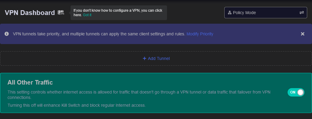 Add a Tunnel in Client section first, then return to VPN dashboard and enable the tunnel, you'll have even more options than before in customizing the policies, it's actually pretty amazing.