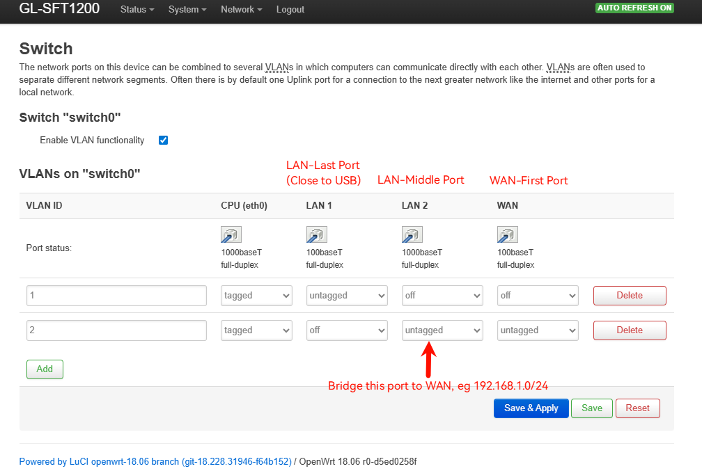 Is it possible to set the LAN1 to switching mode or is there another solution?