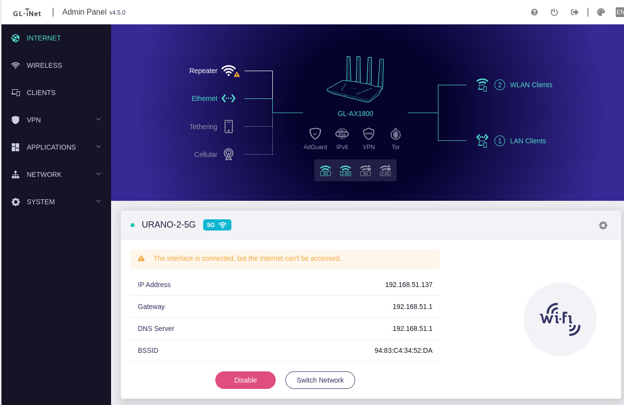 It’s the same Wi-Fi as the GL-AX1800 (5G) using the repeater as the main network.