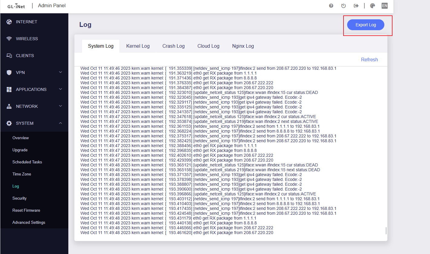 I ran echo 3 > /proc/gl-kmwan/debug before