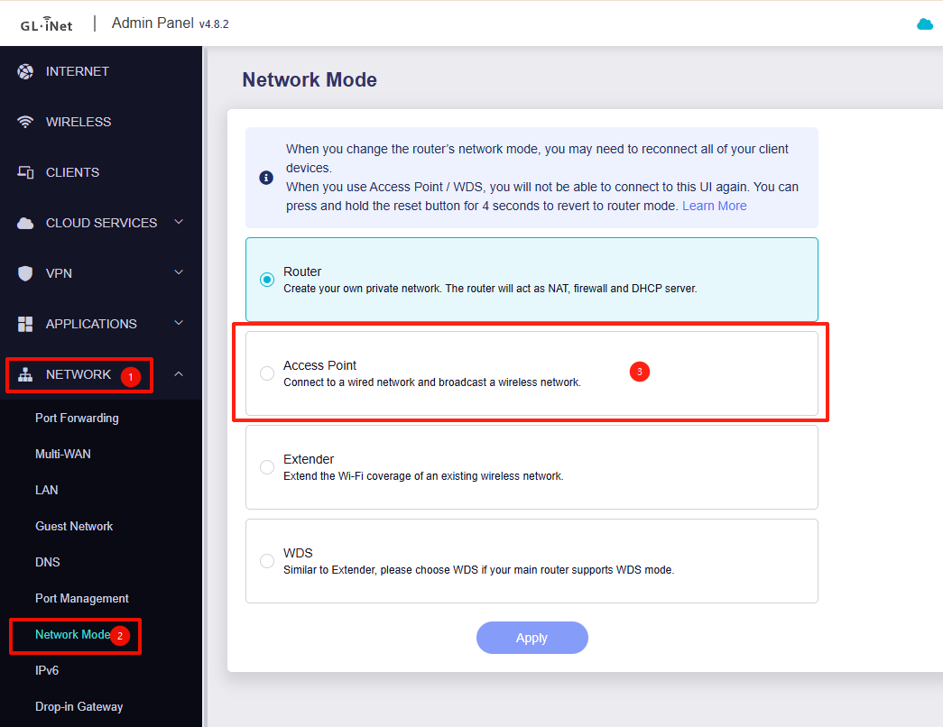 To set this up, simply connect the Slate AX's WAN port to a LAN port on the Flint 2, then go to Admin Panel -> Network -> Network Mode and select Access Point.