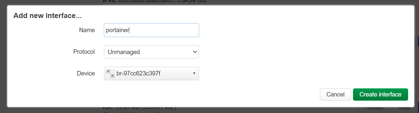 The section he shows with br- stanza is under luci -> network, on this page there are more tabs, and you need to click on devices, docker0 is the standard bridge or network device, but docker containers with their own network use br-<generated name/docker network id> and this one you want to place in a new network interface with protocol unmanaged and new firewall zone, creating this interface you do by clicking back on the interfaces tab next to devices, scroll down add interface.