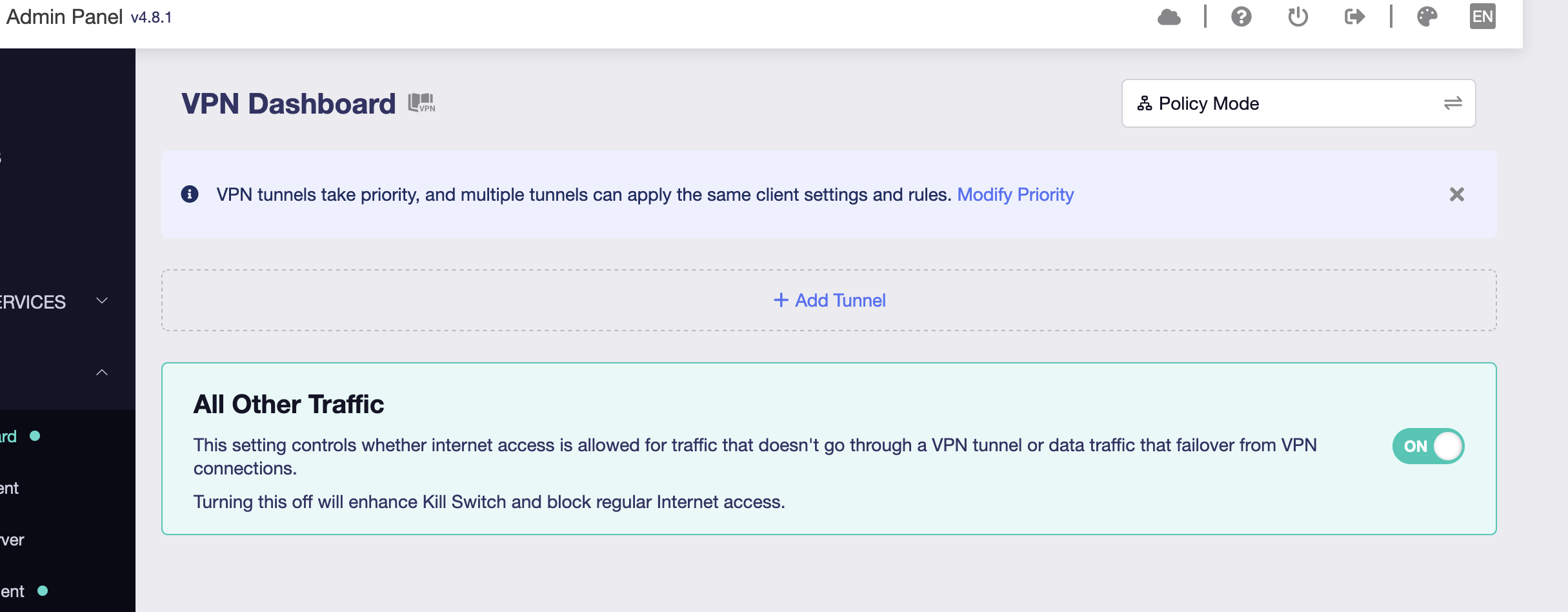 thanku @naive - for any1 reading in the future; this solved the issue. mullvad browser was initially used to access adminpanel. i switched to different brower and this was the fix. i now see policymode and all the tunnels i created when trying to delete the initial tunnels. gui appears to be displaying as it should in accordance w gli documentation.