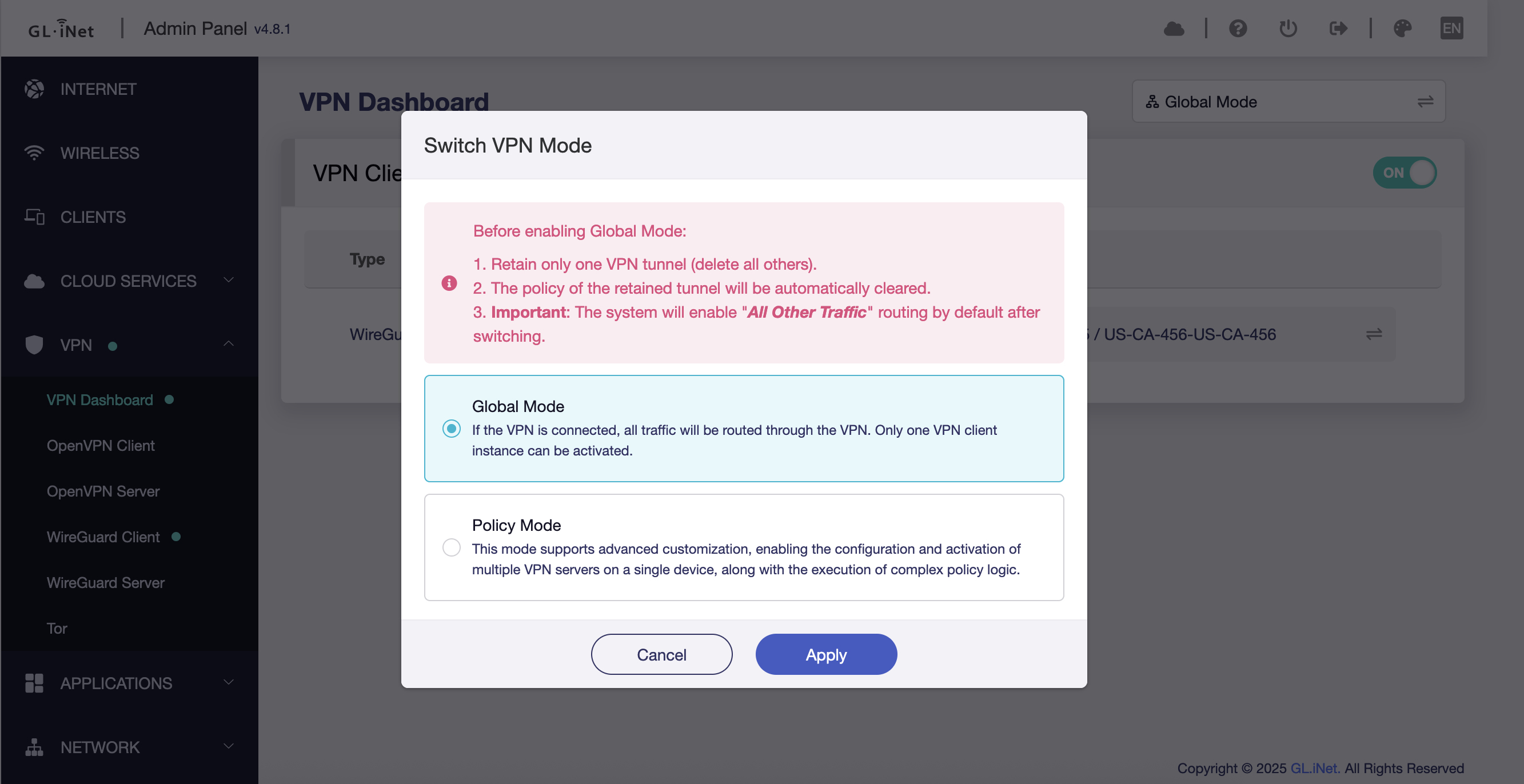 i’m trying to set up my VPN mode as Policy mode. I have run into what I think is a bug. I cannot change out of policy mode to global mode. i was playing around in policy mode, and nowi cannot switch back to global mode. i get a prompt to’delete my vpn tunnels’ in order to switch back. but i cannot delete them