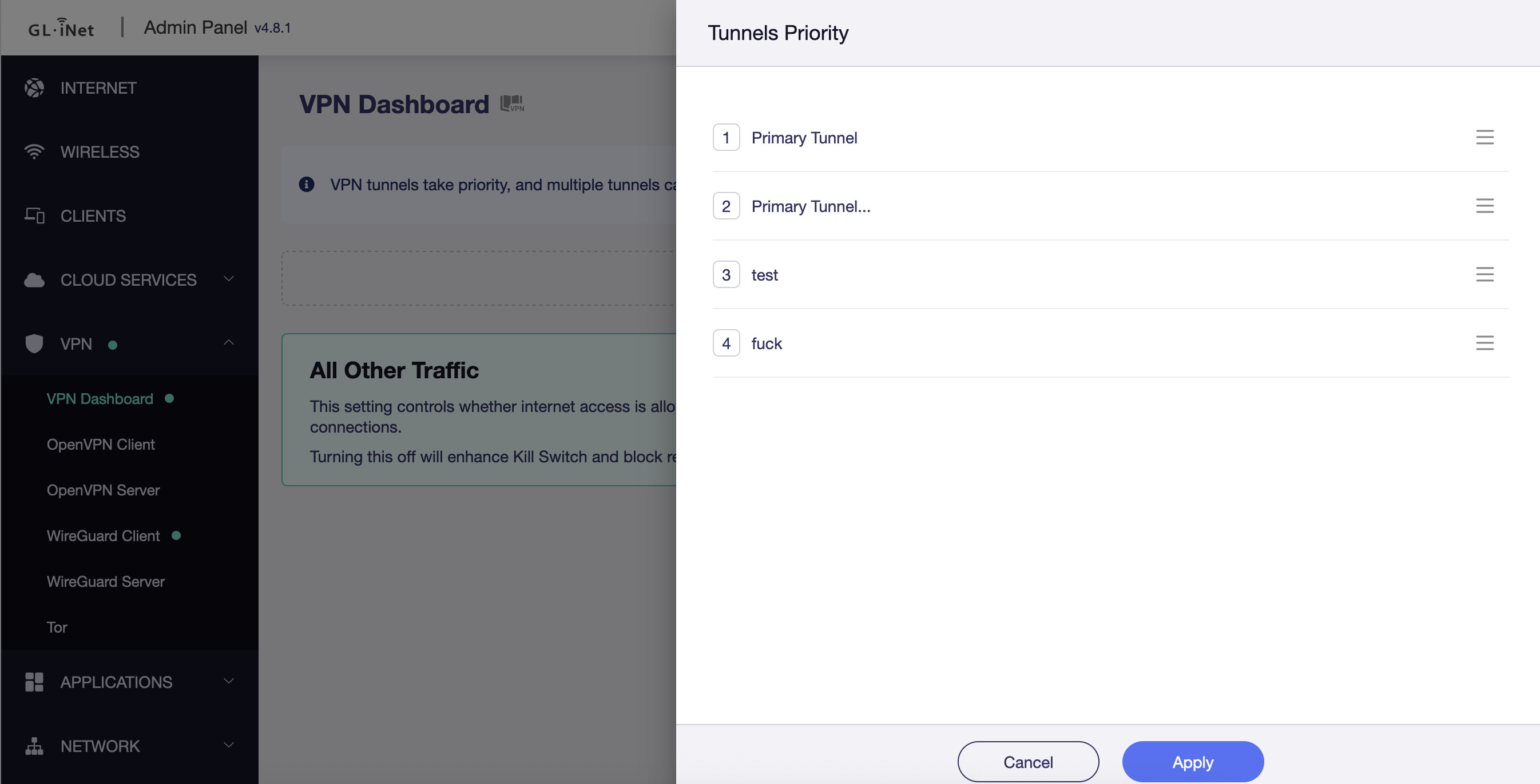 most importantly, underneath the ‘vpn dashboard’ header ont he vpn page, there is a sentence “VPN tunnels take priority, and multiple tunnels can apply the same client settings and rules. Modify Priority” i then click modify priority and this is what i see:
