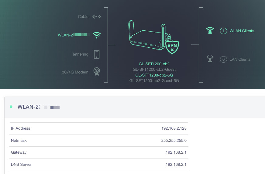 The IP of the router of network A (WLAN-2…) is 192.168.2.1. I can connect from WLAN-2… with WireGuard iOS and macOS app successfully. The GL-SFT1200 (network GL) router, the one that does not connect with WireGuard has the IP 192.168.2.128.