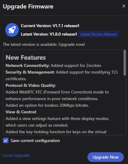 I think that they must have pulled the latest version “glkvm-RM1PE-1.7.0-1107-1762505958” from the download page as it was pants and quite buggy. It would not allow me to access GLKVM cloud services at all when using VPN on my home router but what really killed it for me was a couple of completely random network disconnects at a time when I was unable to have immediate access to the device to power-cycle and which resulted in me losing access to my PC for a good while.