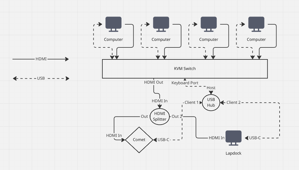 Here's a quick Miro showing the setup, hope it helps! The HDMI splitter and the USB Hub are connected to the KVM switchbox as a host, then both are connected to the Comet and the Lapdock. The best part is that by disabling mass storage on the Comet I can still use hotkeys from both to switch KVM inputs!