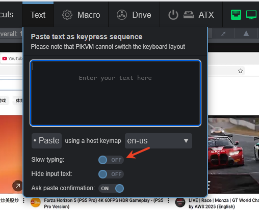 This is related to the software you paste to. For example, Windows Notepad does not support entering text at a very fast speed. If you try to use KVM to paste content into Notepad, you will find that many characters are missed. If you encounter this situation, the feature you need is to reduce the speed of pasting.