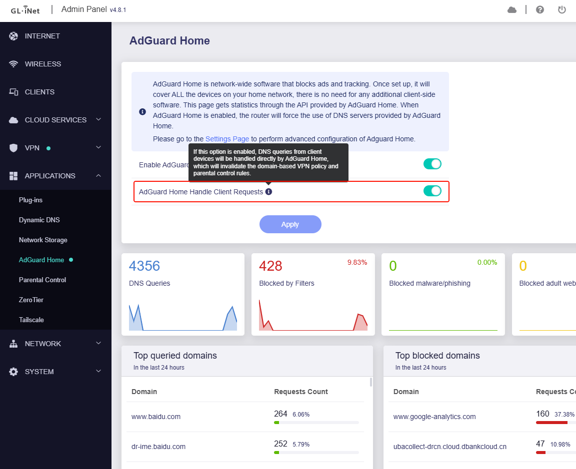 If you enable an OpenVPN client based on domain, the router works as expected, it uses the VPN DNS for the VPN traffic and the WAN DNS for the rest of the traffic. BUT as soon as you enable AdGuard Home there are DNS Leaks, the VPN traffic uses the Adguard DNS and the local LAN traffic uses the VPN DNS instead of only using AdGuard. They basically mix each other. Please GL Team release a fix for this, always ensuring that VPN traffic uses the VPN DNS and local traffic only uses AdGuard. @bruce@alzhao