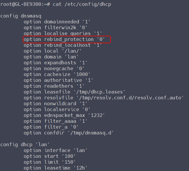 I deleted this line in the dhcp config file and executed following command: uci commit dhcp && /etc/init.d/dnsmasq restart