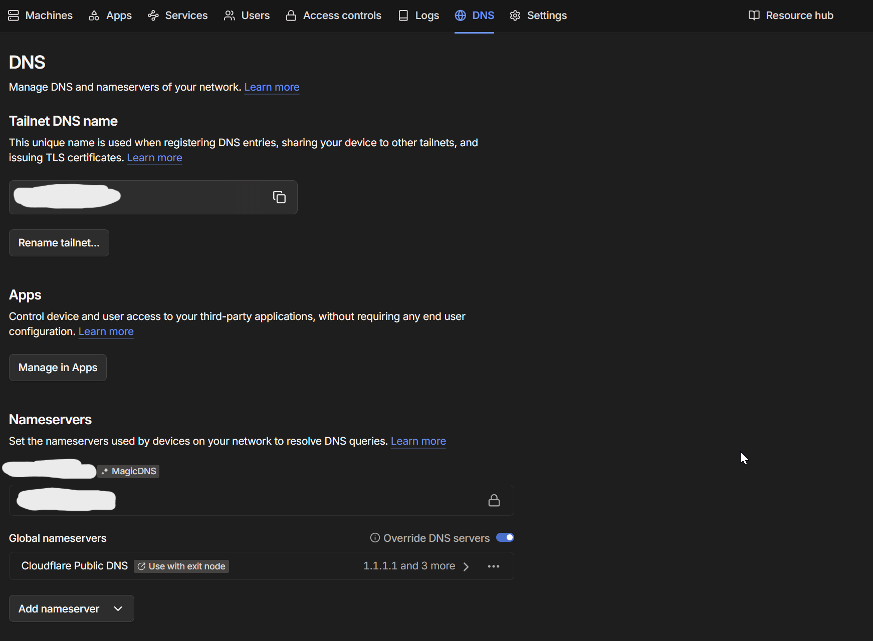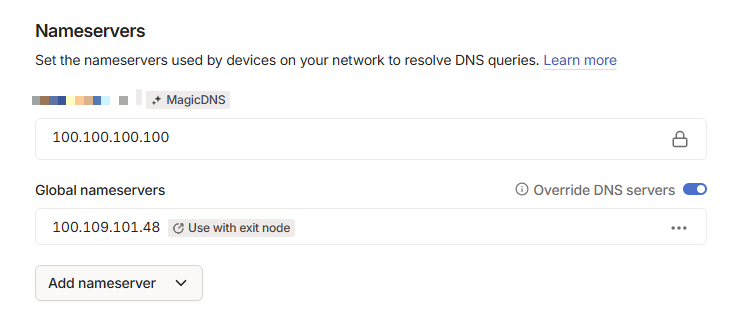 My Tailscale Flint 3 device connects to Cloudflare as the exit node, as shown in the DNS settings. When I completely delete it, it connects to the default DNS, but no matter what I do, AdGuard Home and the manually entered DNS in the AdGuard Home DNS settings don't show up as ad-blocking. (My goal is to connect remotely from my phone using mobile data, using the ad-blocking service on my home network, as if I were at home.)