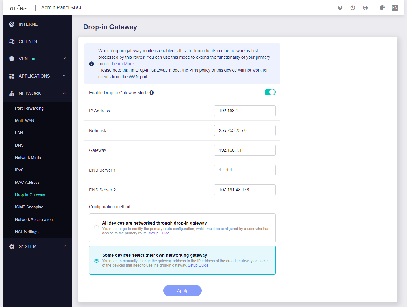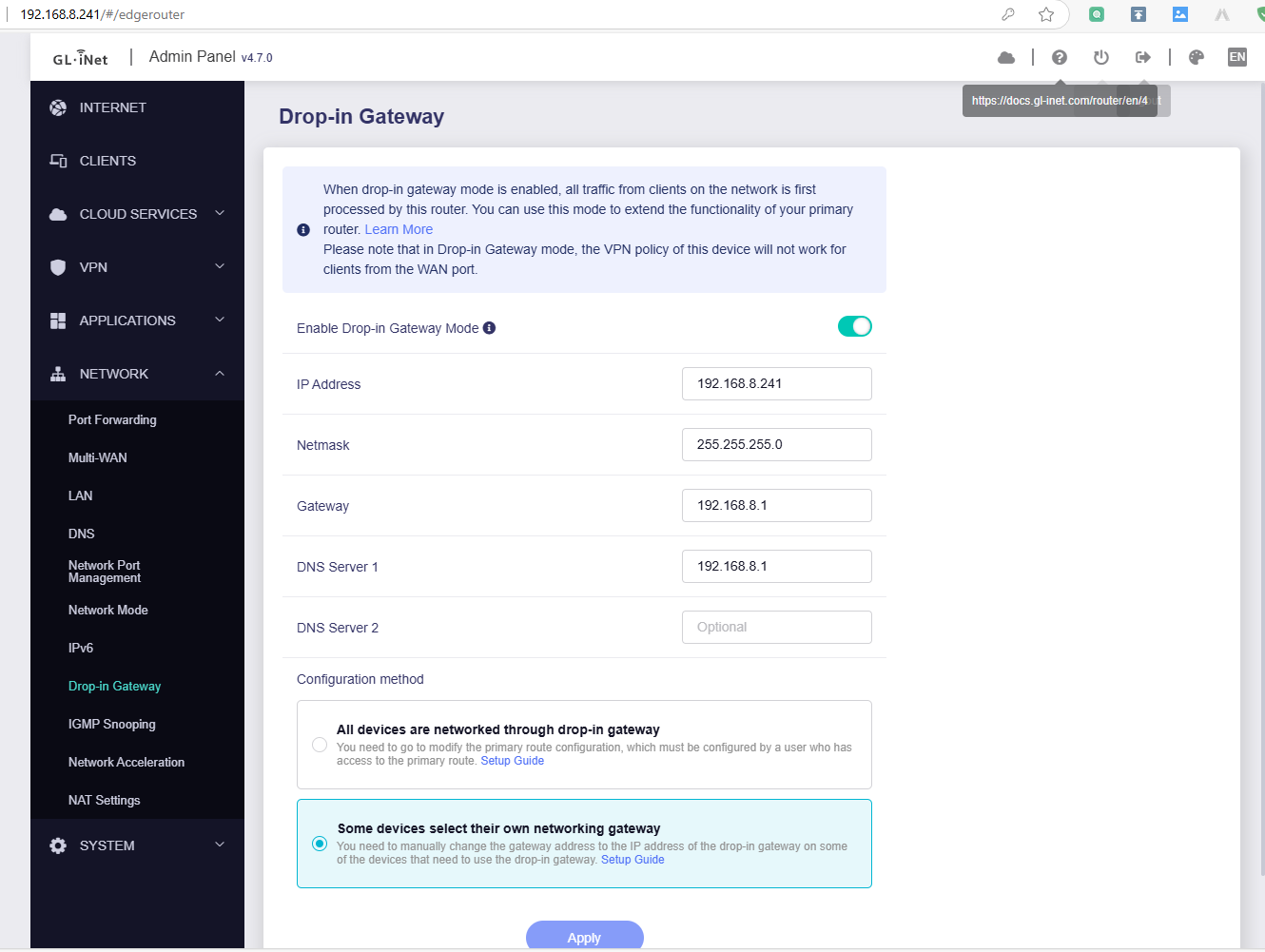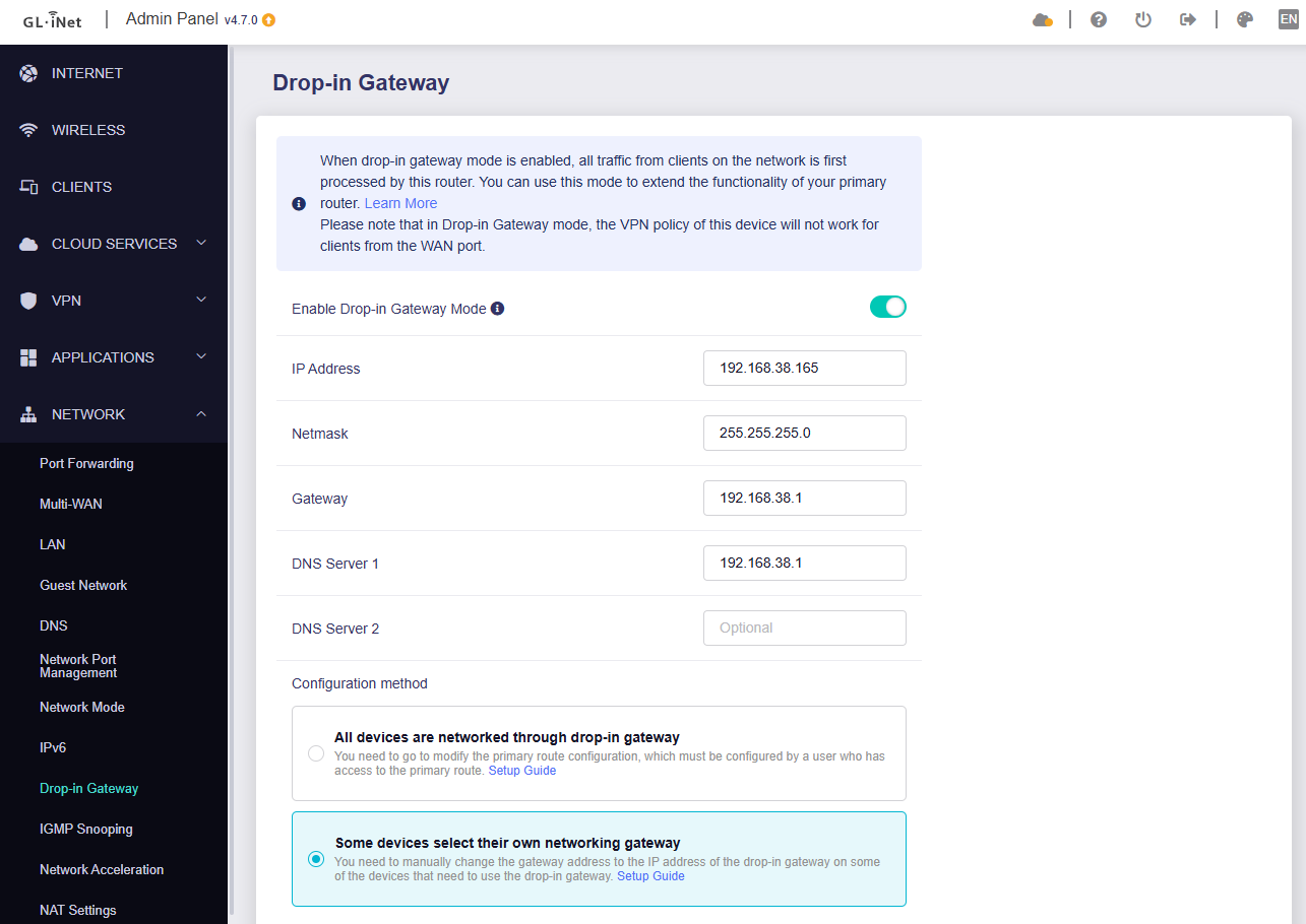 Drop-in Gateway router: MT2500 v4.7.0, 192.168.8.241/24