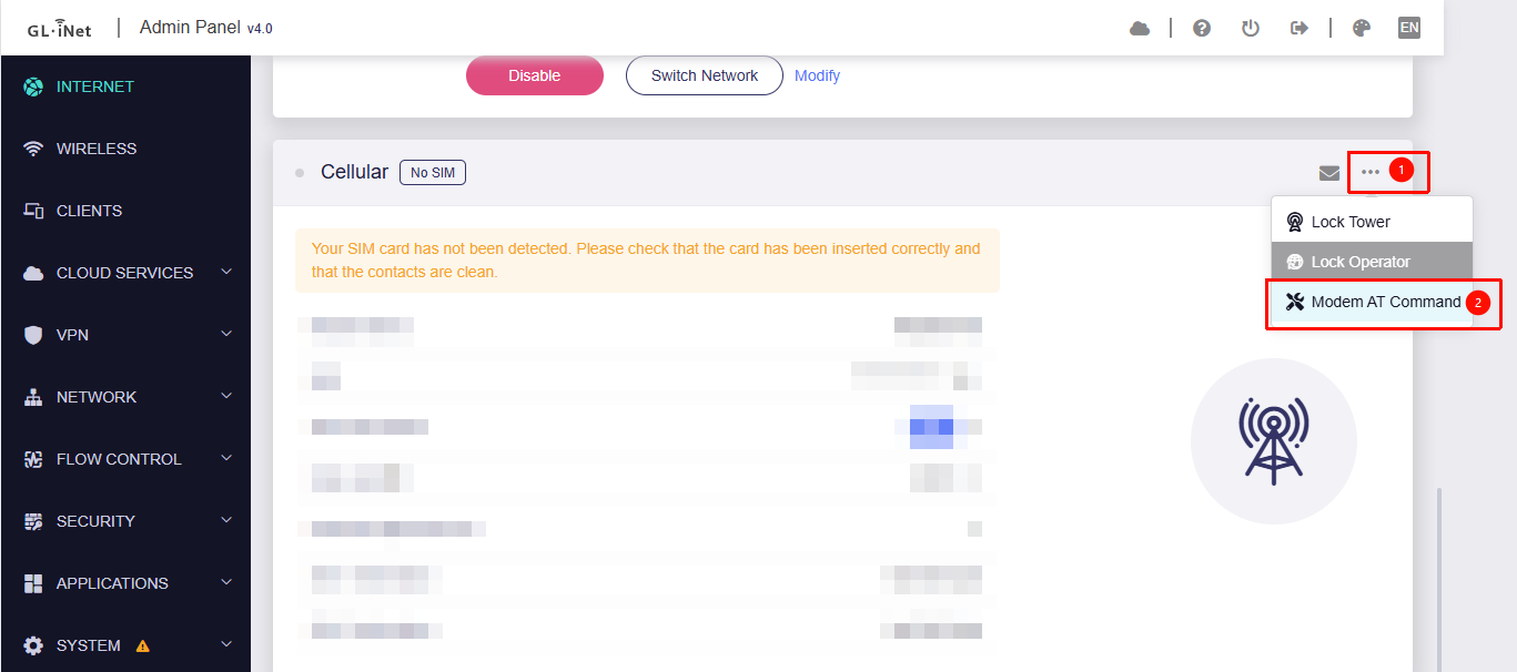 AT commands can be executed in the GL UI, as shown in the screenshot.