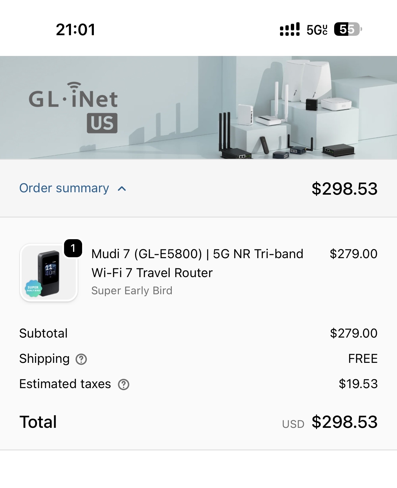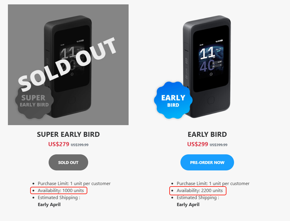 Ya you didn’t do it quick enough. It only showed the super early bird sold out. I was able to grab the mudi 7 with early bird and the comet 5G with the super early bird. My card was also processed and the order went through. Hopefully they do not cancel them.