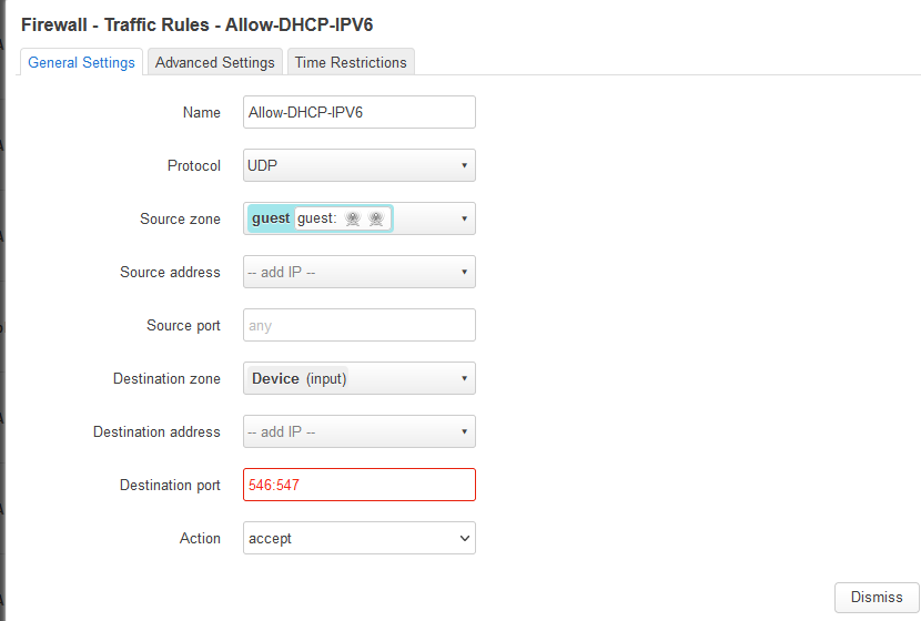 From what I remember the issue was mainly with the protocol setting, although it looks like LuCI isn’t happy about the destination port in your screenshot. Change it to 546-547 and I think it’ll accept it.