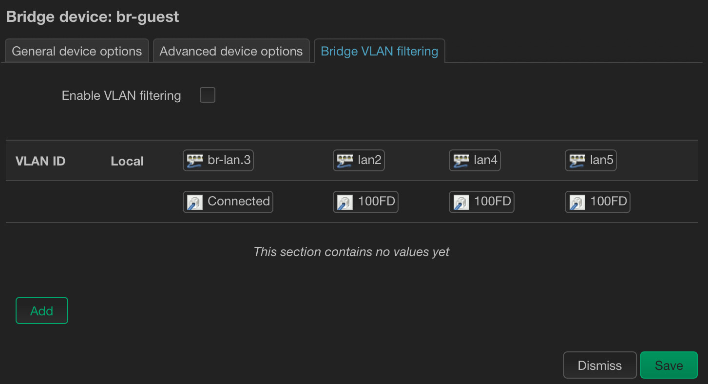 Also, be mindful of this apparent bug in the LUCI GUI when applying VLAN settings on the br-lan bridge device. Whenever I modify any settings on the br-lan bridge device, I have to ensure that the ‘Enable VLAN Filtering’ checkbox is not checked or it kills the br-lan network.