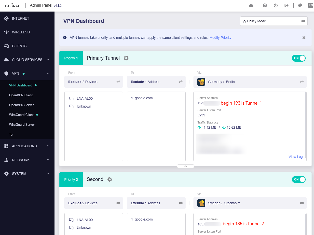 Tunnel 1 server IP begins 193, Tunnel 2 server IP begins 185