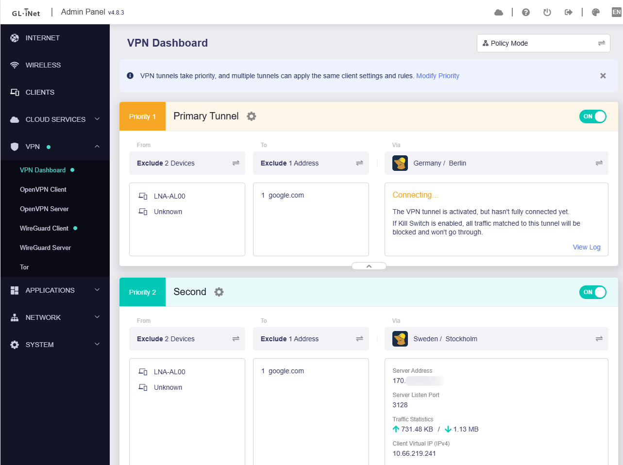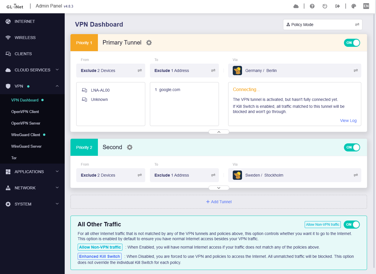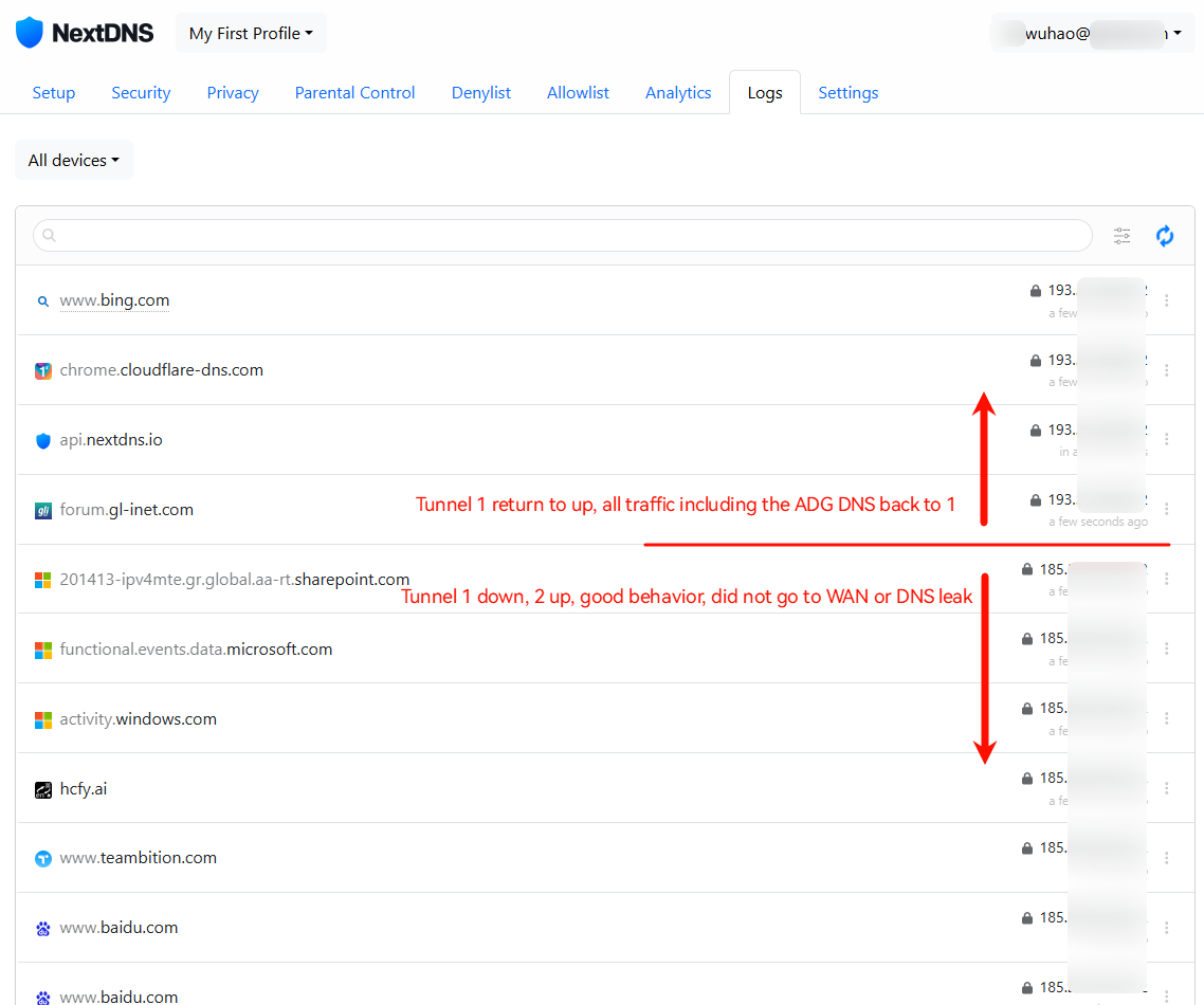 This morning Mullvad's Tunnel 1 went down so Tunnel 1 is supposed to jump to Tunnel 2 since is in failover mode. And it does, but then again in Nextdns logs I see my Wan address, not Tunnel 2 address.