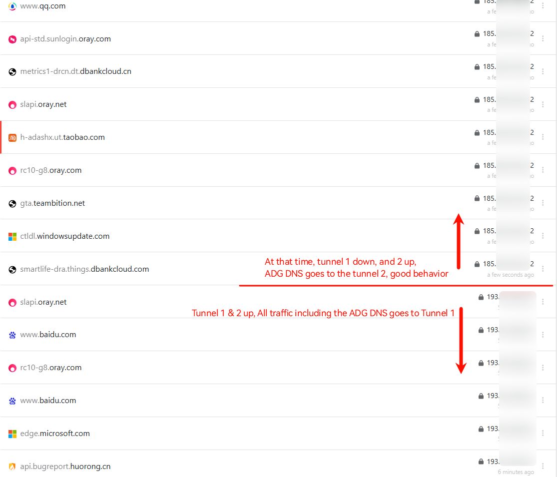 Tunnel 1 exit is 193.x.x.183, Tunnel 2 exit is 193.x.x.211, check the NextDNS log, DNS traffic without issue: