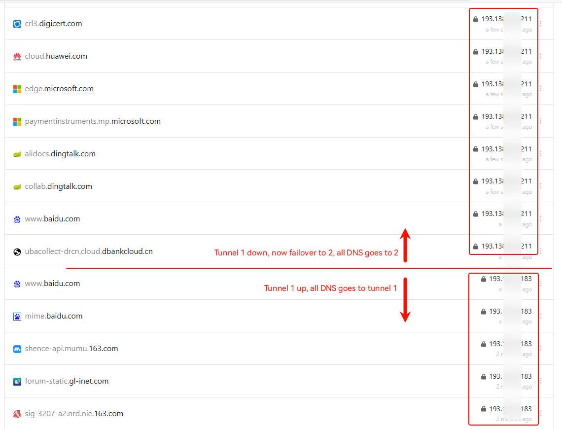 When the Tunnel1 down, all traffic includes DNS requests, go to Tunnel 2, without issue: