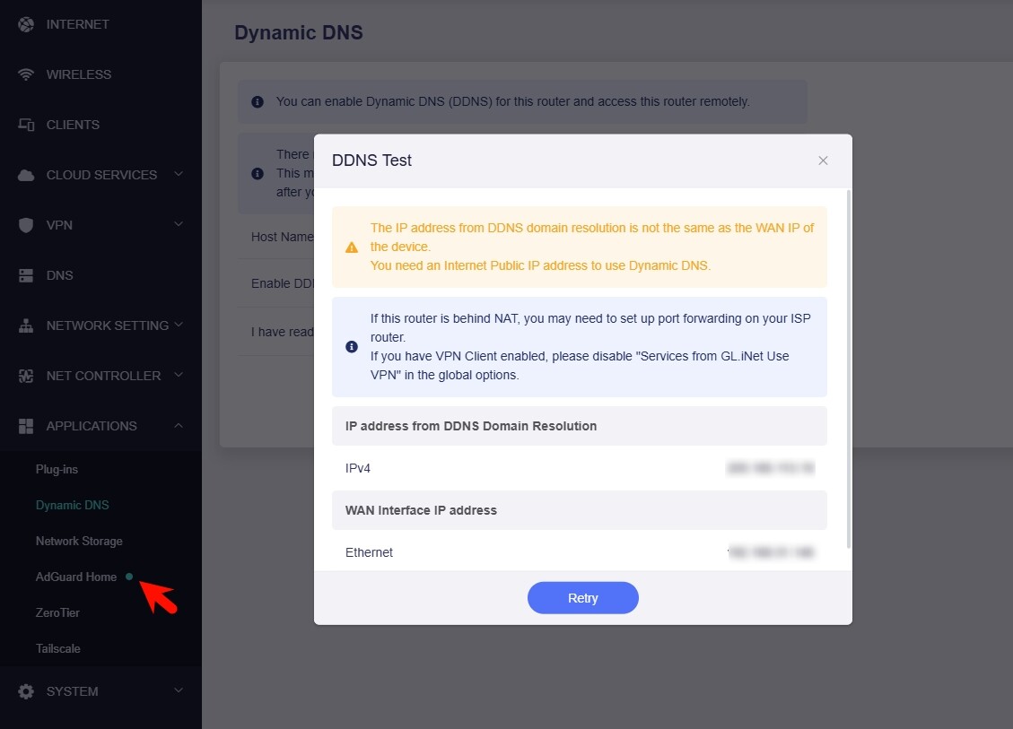 Please try disabling the ADG, and check the DDNS test again to see if it works fine.