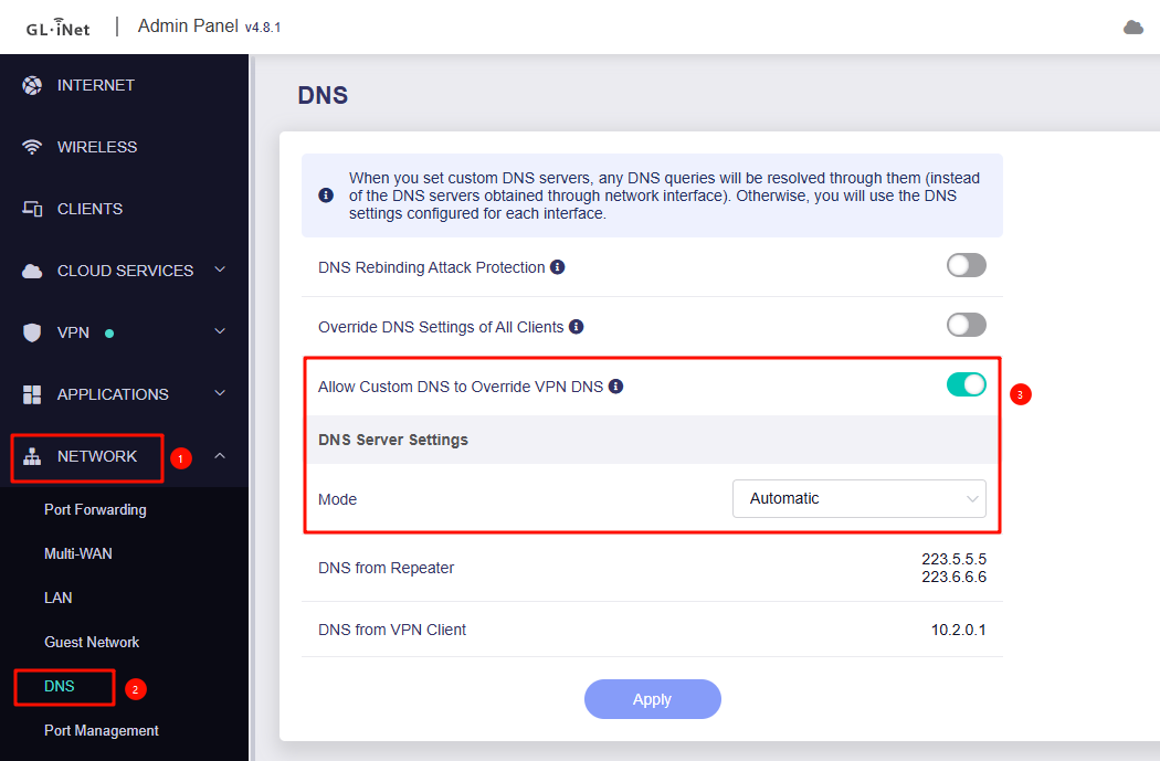 If “Allow Custom DNS to Override VPN DNS” is enabled, ensure that Network > DNS is set to Automatic in the Admin Panel.