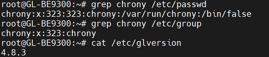 We checked the Flint 3 on v4.8.3 firmware, and the chrony user and group are added correctly by default.