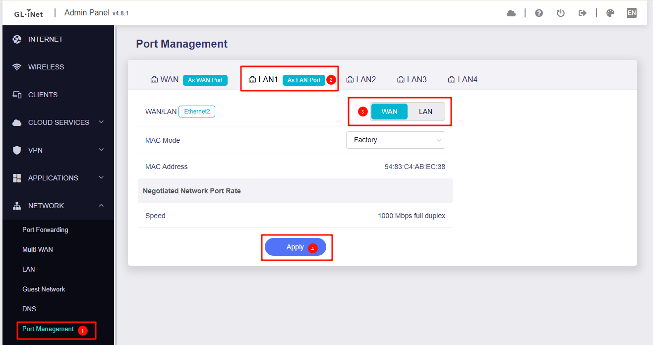 I tried switching the WAN interface to LAN 1 via the "Port Management" UI as shown in your screenshot. However, after applying the change and moving the cable, the PPPoE connection fails to establish and I cannot connect to the internet.