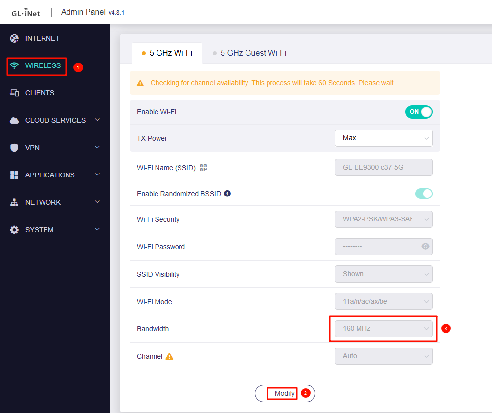 For 5 GHz, ensure that 160 MHz channel width is enabled so the full bandwidth can be utilized.