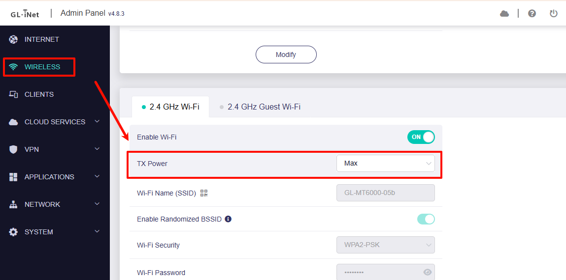 Afterwards, go to GL UI → Admin Panel → Wireless and set the transmit power to maximum.