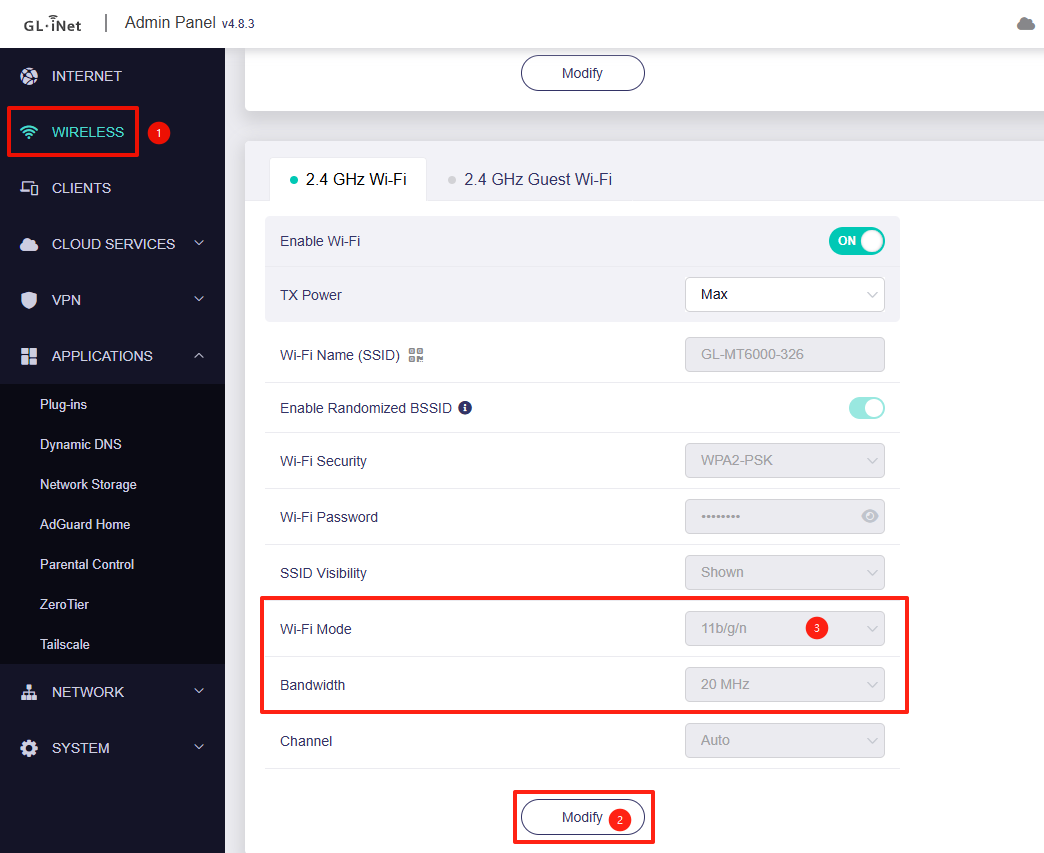 Set the 2.4 GHz Wi-Fi mode to 11b/g/n and the bandwidth to 20 MHz.
