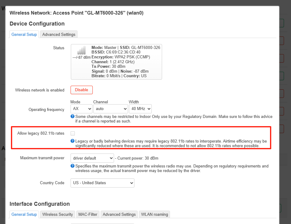This confirms that the issue has been resolved in the current stable firmware, as the “Allow legacy 802.11b rates” option was not available in any previous Flint 2 firmware. I was not aware that this option had been introduced in op24.