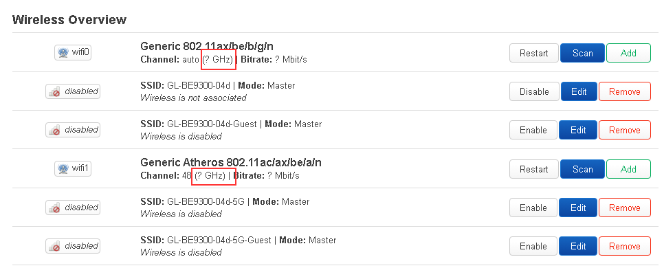 I’ve verified that my country is configured correctly. I tried manually setting both non-DFS and DFS channels with no success. I also upgraded to the latest firmware and downgraded again, but that didn’t help either. In LuCI, the 2.4 GHz and 5 GHz options don’t appear at all.